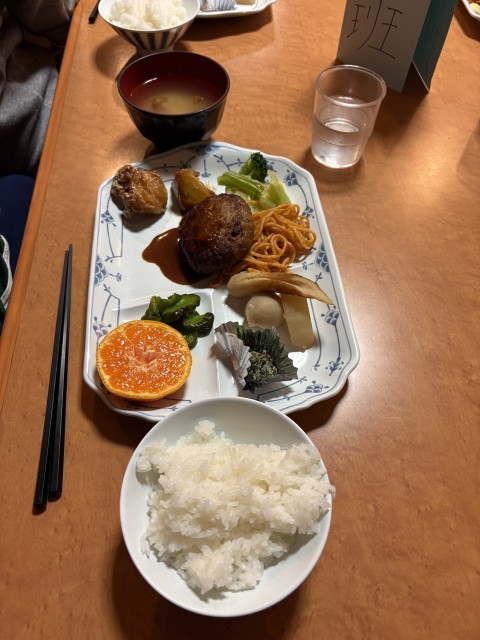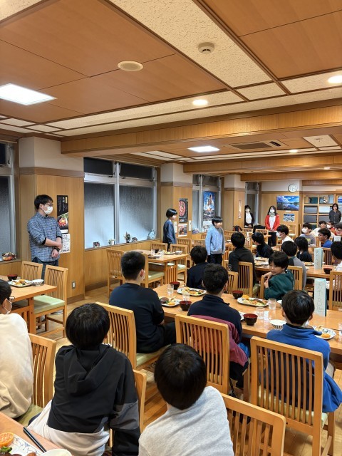入浴後、開校式を行い、待ちに待った夕食です。「米がうまい!」「米だけで食べられる」と大人気。何杯もおかわりしていました。