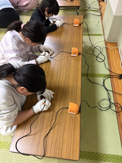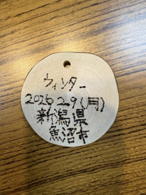 夕食後は、ナイトプログラム。ウッドバーニングでオリジナルのキーホルダーを作りました。魚沼市のブナの木にデザインし、300度の熱で焦がして作り上げました。