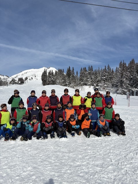須原スキー場に着きました。開校式でインストラクターさんに挨拶。集合写真を撮ってグループごとにスタート。