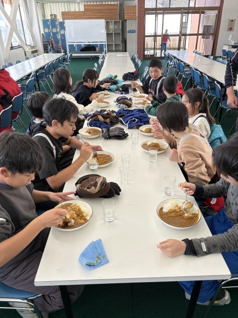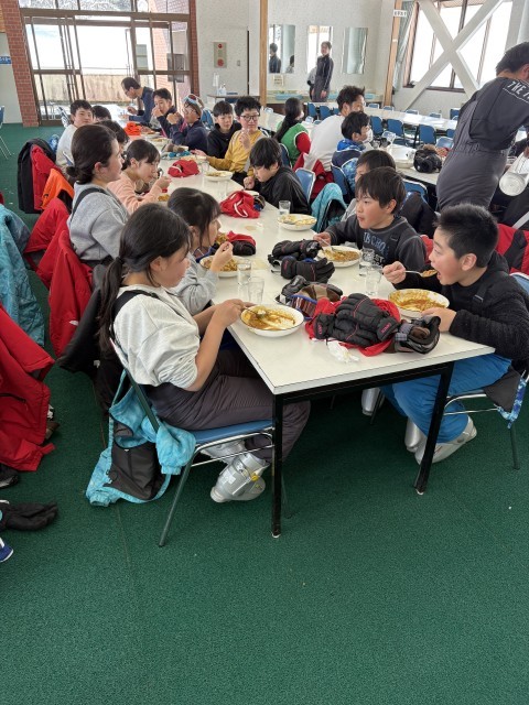 たくさんスキーをしたのでお腹ペコペコ。食堂で美味しいカレーをいただきました。これから午後のスキーへ出発です。