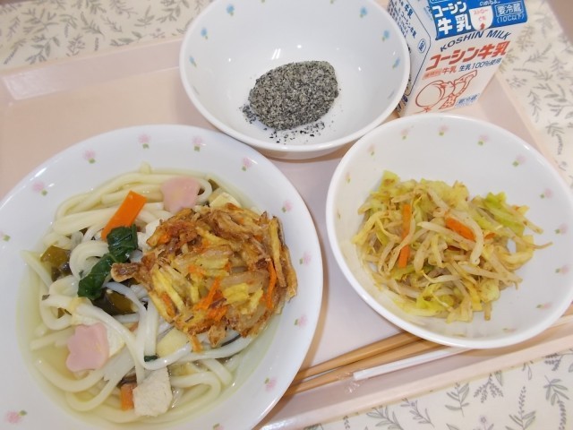 わかめうどん 牛乳 しらすのかきあげ もやしのおかか和え 黒ごまぼたもち