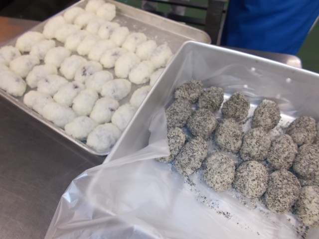 つぶしたもち米であんを包み、黒すりごまをまぶしました。