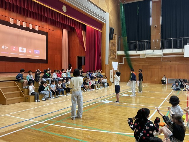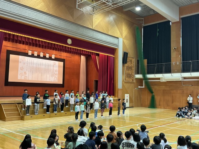 1年生は緊張しながらも、優しい6年生と手を繋ぎながら入場しました。2年生〜6年生は「とっても似合いの名コンビ」を歌い、一年生の入学をお祝いしました。また、企画委員会の学校クイズは大いに盛り上がりました。お礼に1年生から立派な言葉と、元気な歌が披露されました。