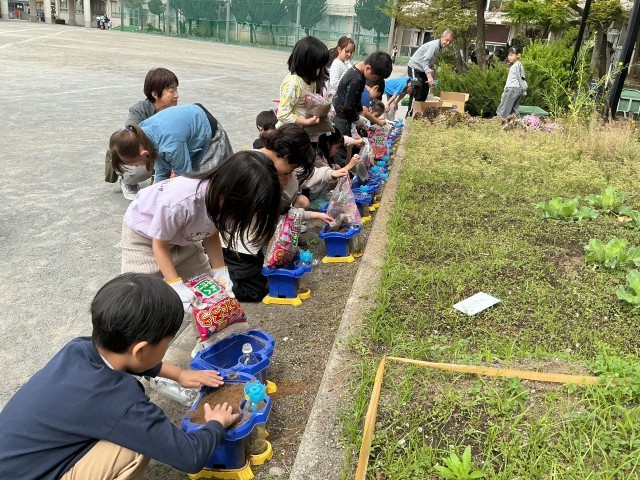 生活科の学習では、植物の成長を学んでいきます。ミニトマトの苗を植えました。1学期は、この小さな苗がどう成長していくのか、観察します。実ができたら、ぜひご家庭で一緒に食べてください。