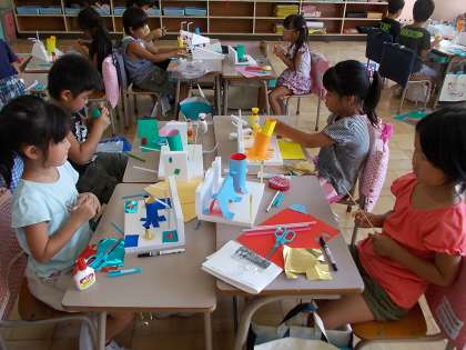 作ったものを早速浮かべて遊びました。お友達と浮かべてみたり、早さを競ったり、自分の作品を作り直しながらも楽しく遊びました。