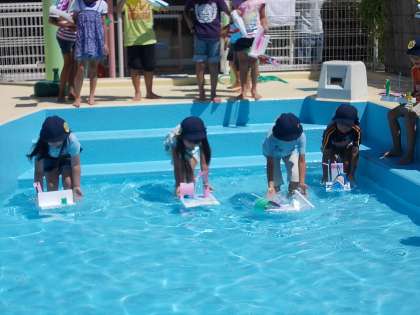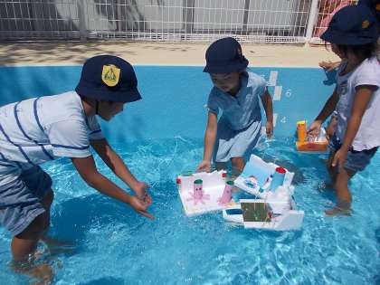 発砲スチロールを好きな形に切って、船にしたりロケットにしたりして、プールに浮かべて遊びました。