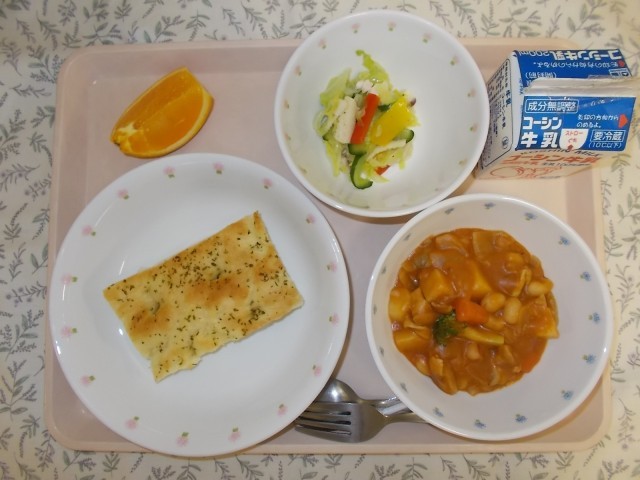 フォカッチャ 牛乳 イタリアンサラダ チキンカチャトーラ オレンジ 今日の給食は...