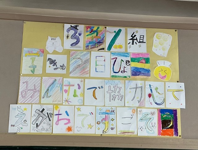 クラス全員で決めた学級目標の文字を、1文字ずつ担当して作りました。互いに協力し、...
