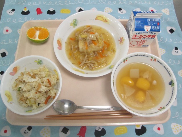お月見といえば月見団子、篠崎第二小学校ではお月さまをイメージしたかぼちゃの白玉でかぼちゃの白玉汁を提供しました。