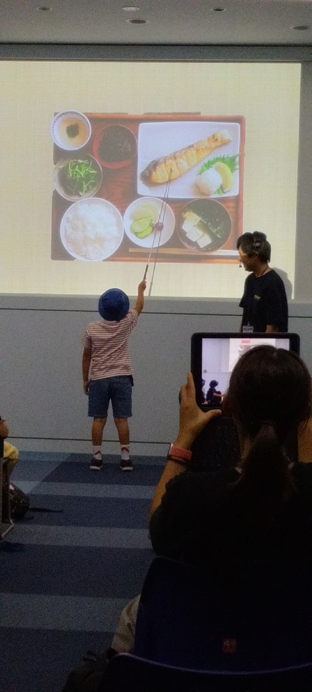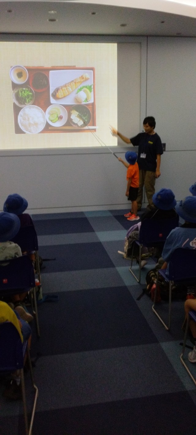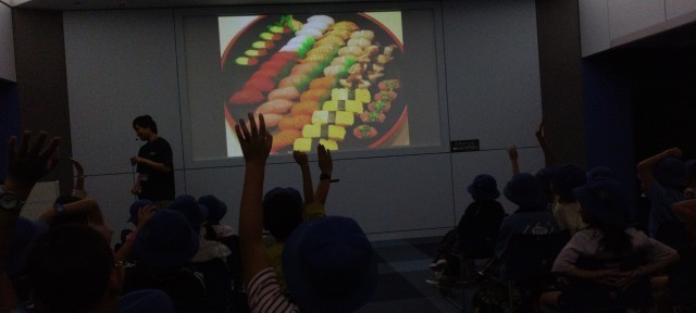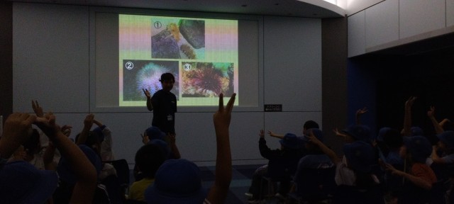 見学のあとは、水族園の方から海の生き物について教えていただきました。今回は、寿司のネタをもとにした、マグロとタコ、ウニでした。住んでいる所や生活の仕方などいろいろ教えてもらいました。