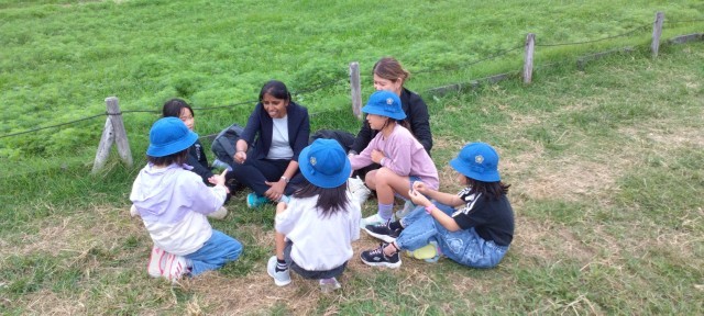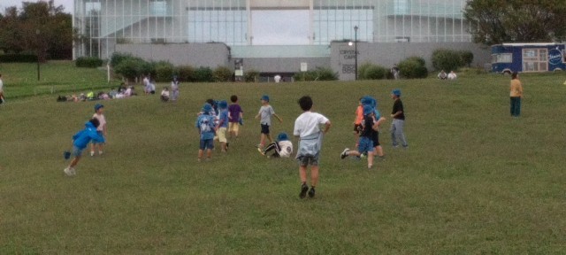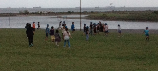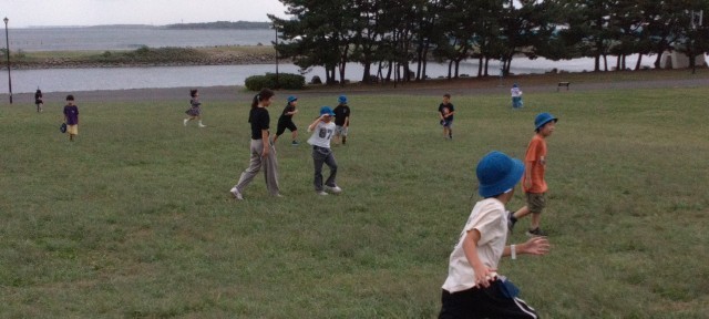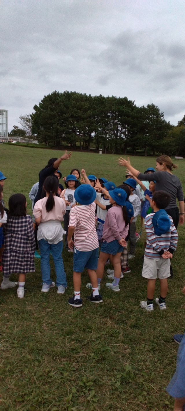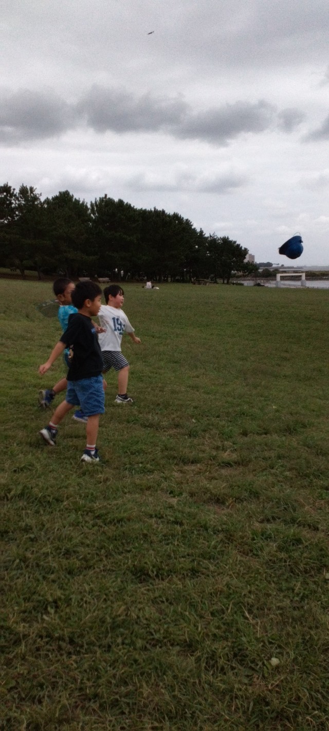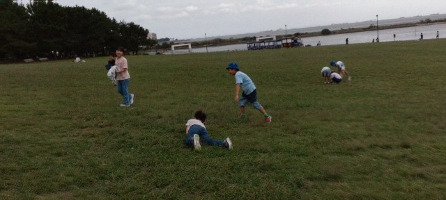食後の自由遊びです。鬼ごっこを士たり、英語の先生と遊んだり、転がったり、帽子飛ばしをしたり…。いろいろ楽しんでいました。