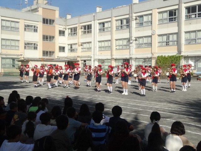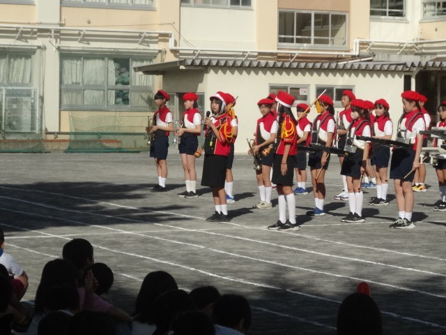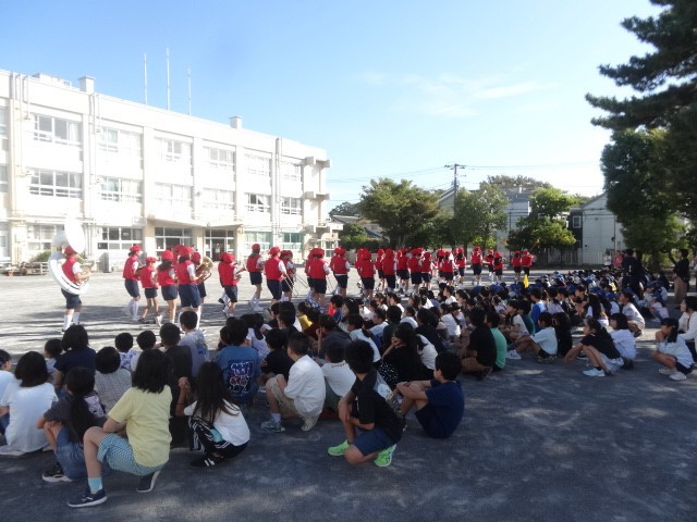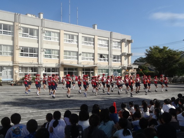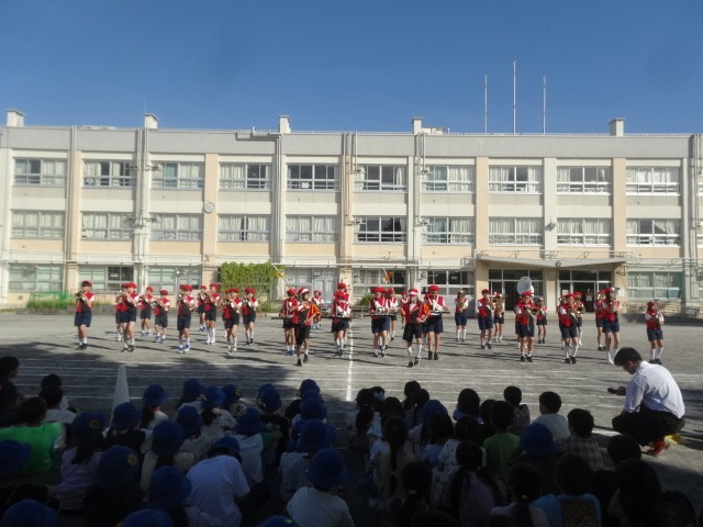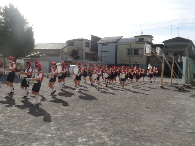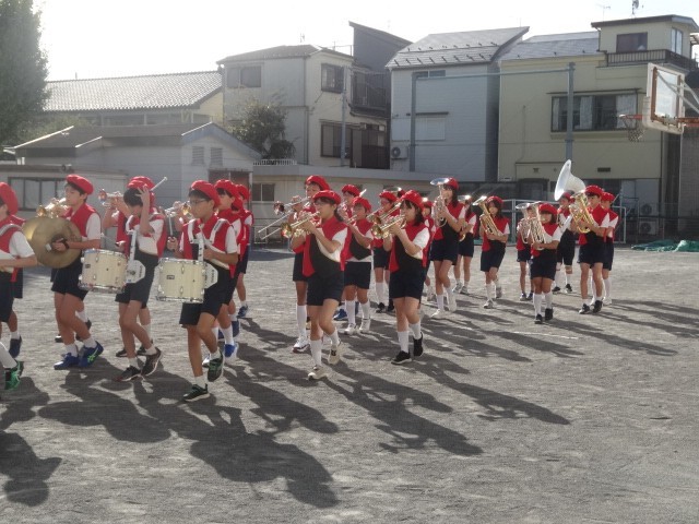 日曜日の区民祭のパレードに向けて校内でマーチングを披露しました。衣装も新しくなり、正式にお披露目となりました。
