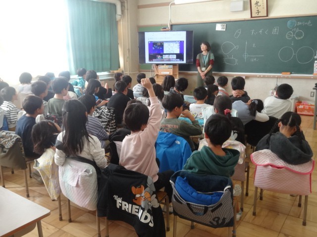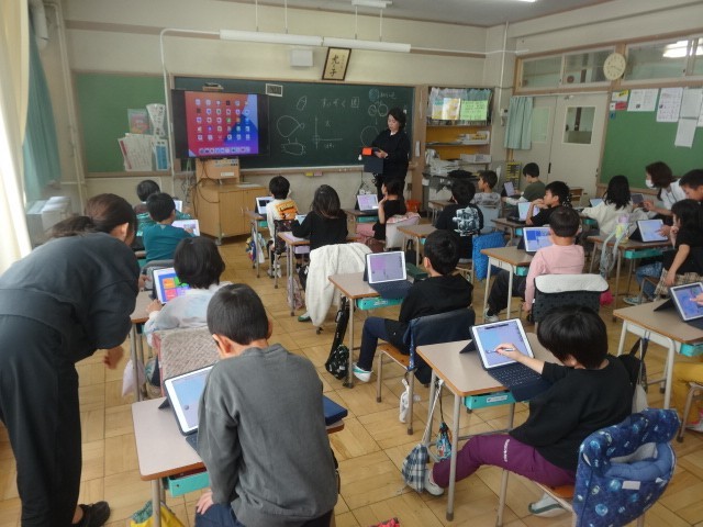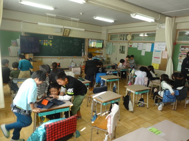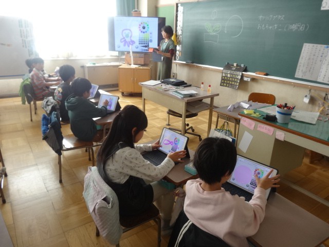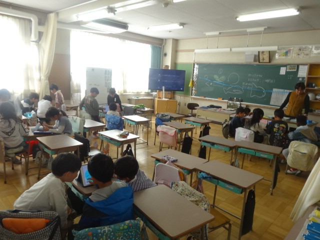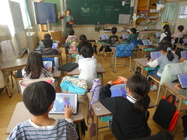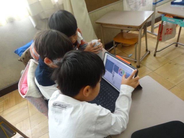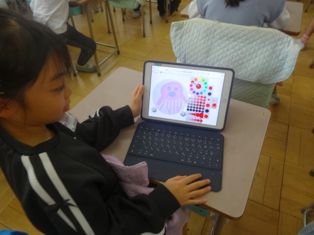 2年生は、生活科見学で葛西臨海水族園に行ったことを生かして、デジタル水族園をつくります。タブレットで「ビスケット」というwebサイトを使って作りました。作り方は、簡単なプログラミングの手法を使うのですが、子供たちはすぐに作り方を飲み込んで楽しんで作っていました。