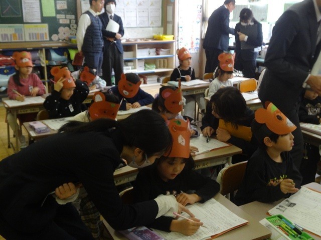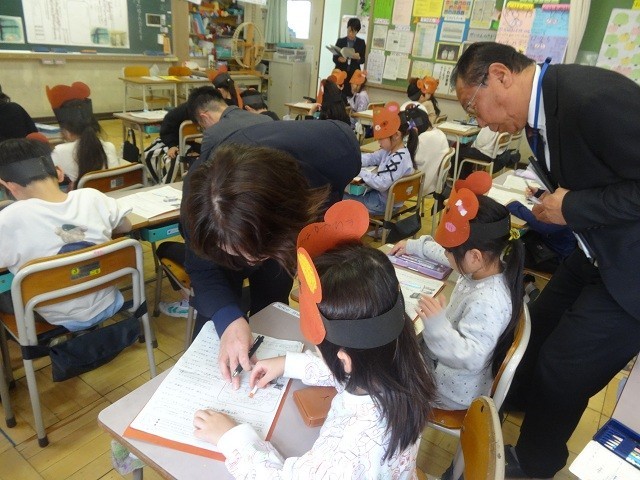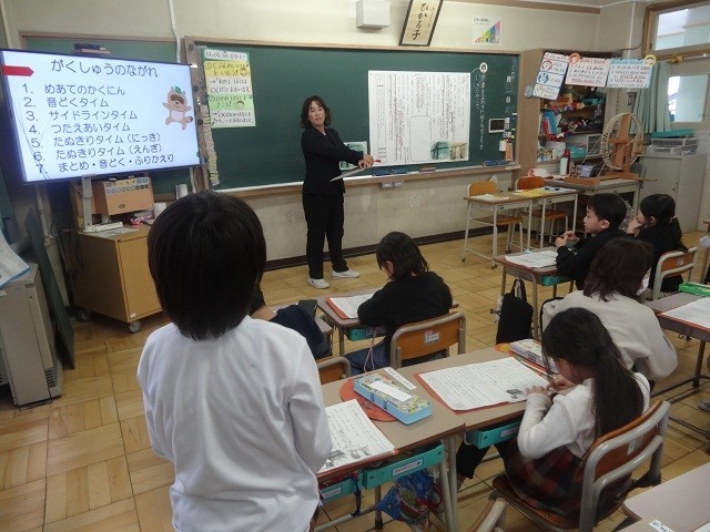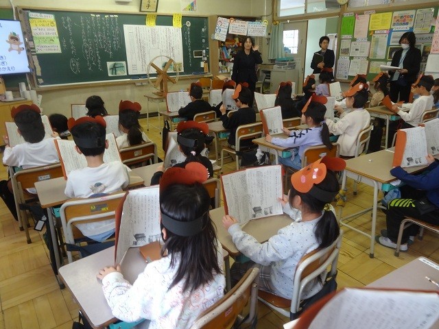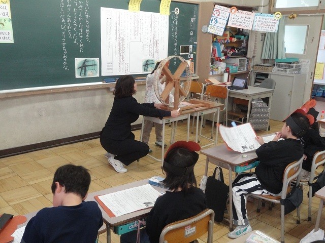 初任者研修で、区内の先生方が授業参観に来ました。単元は、「たぬきの糸車」です。