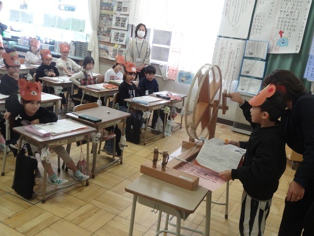 途中たぬきのお面をかぶり、たぬきになりきりながら気持ちを考えていました。実際に糸車をまわしてみることもしました。