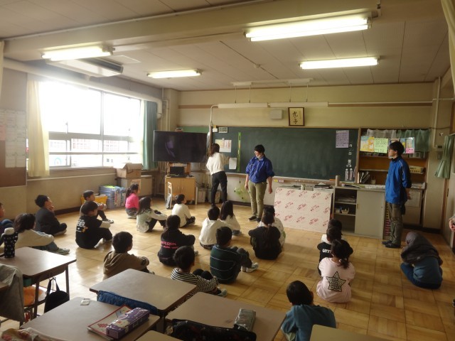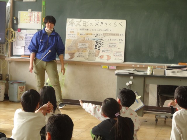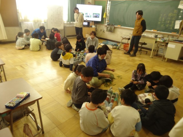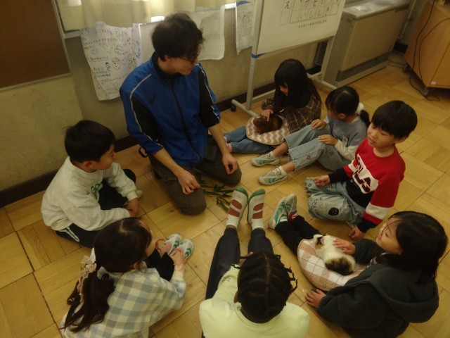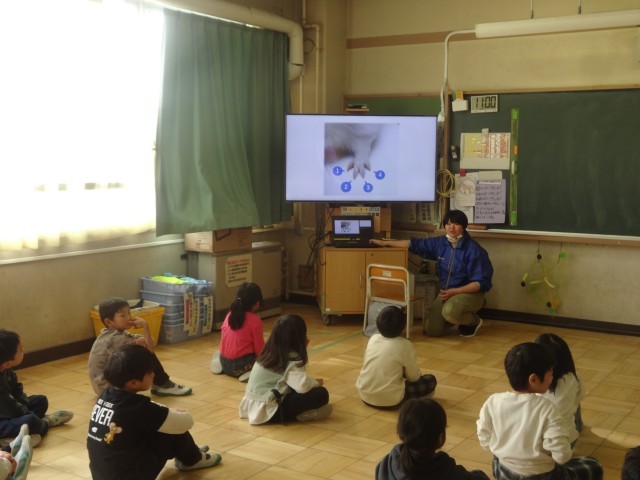 2年生は、3学期に約1週間程モルモットの飼育体験を行います。この日は、行船公園の自然動物公園から飼育員の方々がいらしてくださり、モルモットについて飼育法も含めていろいろ教えてくださいました。