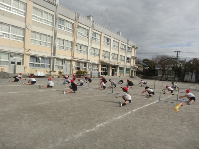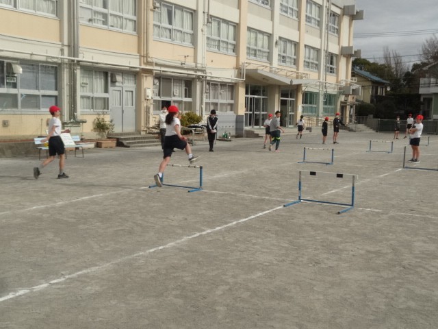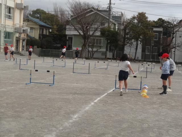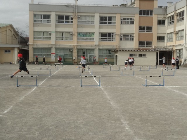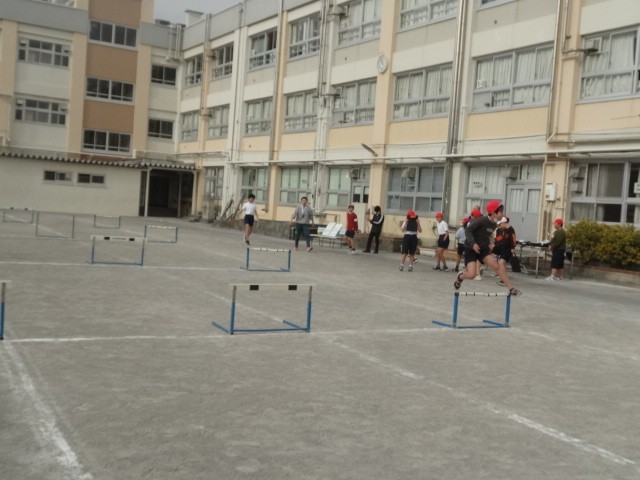 この日の体育は、ハードル走でした。ハードル走のポイントは、ぴょこんぴょこんと跳ぶのではなく、またぎ超す感じとよく言われますが、走る方はハードルバーに引っかかるのではないかと怖いものです。そのことを踏まえて様々な練習を行っています。