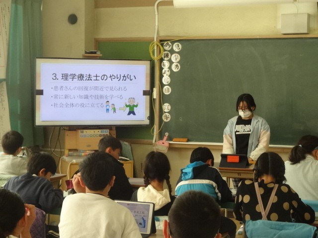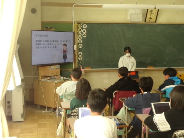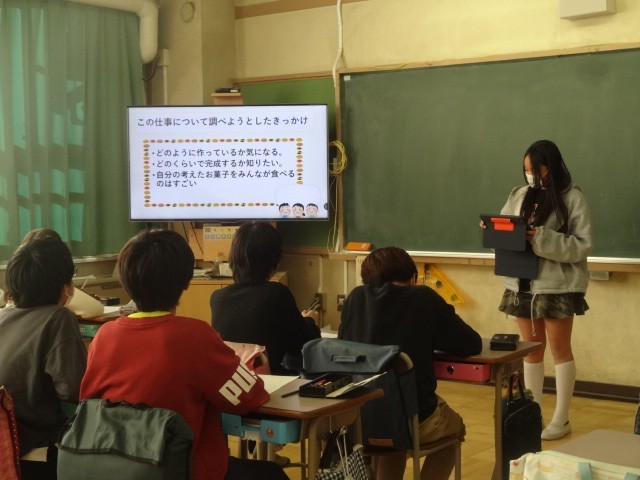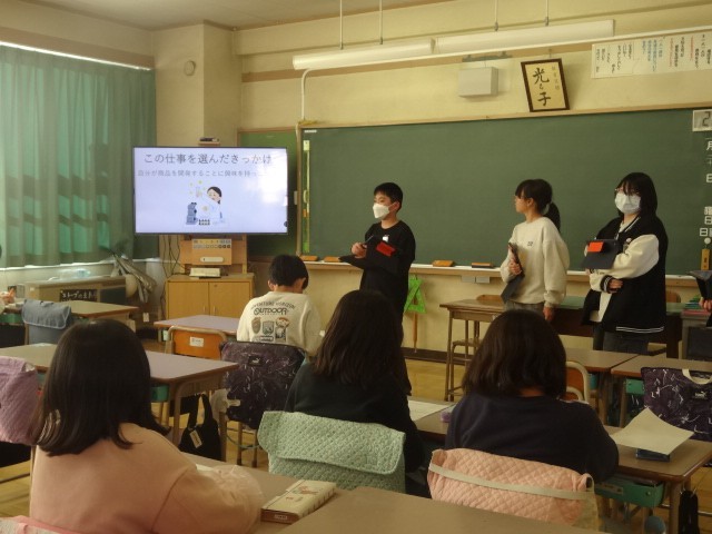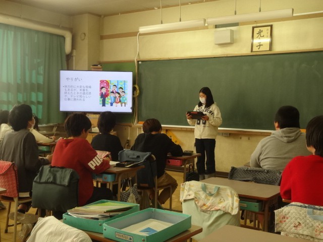 6年生は、5年生に対して「仕事」のことを調べ発表しました。前半が2組、後半が1組です。