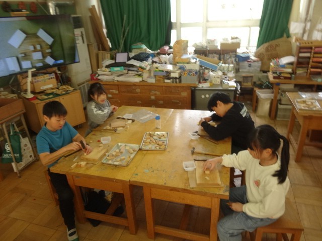 木片を使って釘打ちを行っていました。木片は、様々な形や大きさがあるのですが、使っていいのは1人10個までと制限があるようです。その中で配置も工夫しながら作品をつくっていました。図工室中「トンカン・トンカン」響いていました。楽しそうでした。