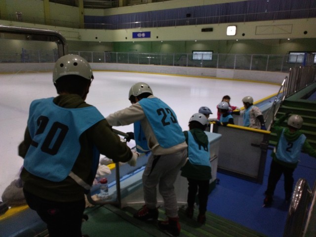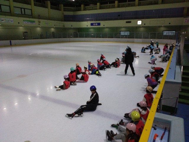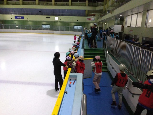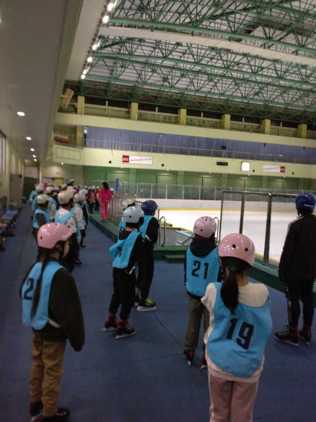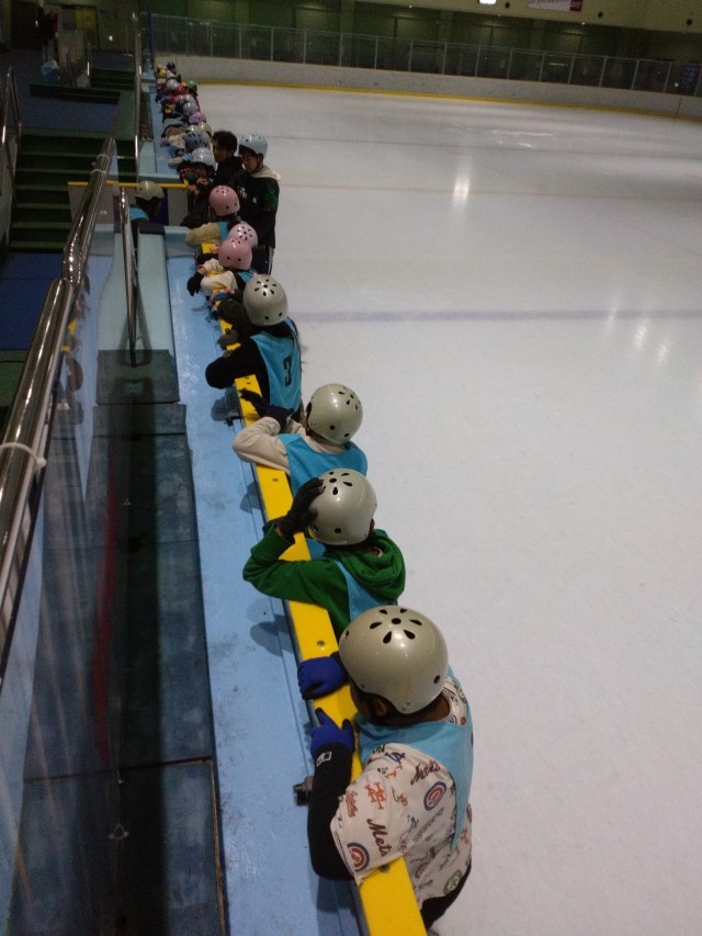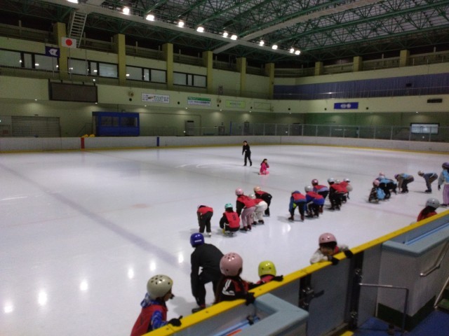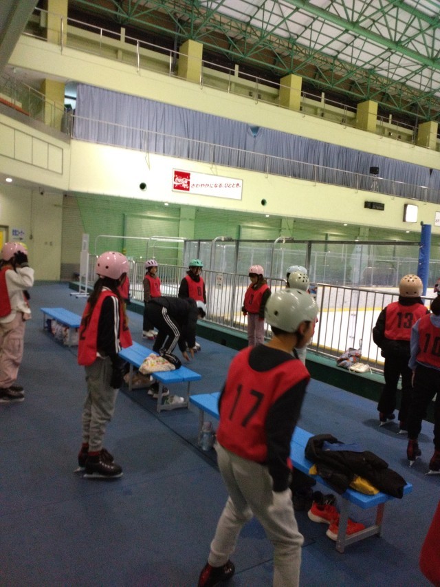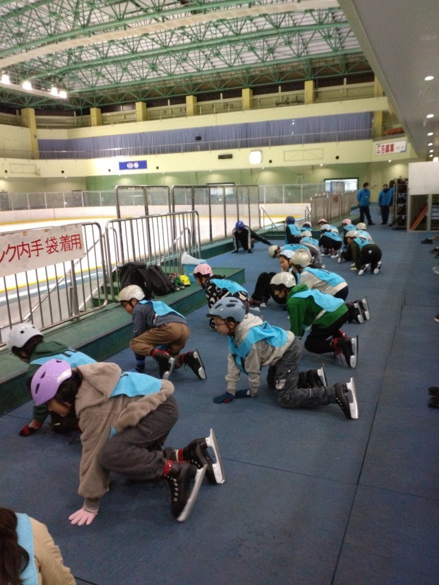 まず、陸で準備体操をして、その後は、転び方、立ち方の練習です。そして、いよいよリンクにおります。
