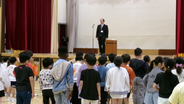 今年度初の全校朝会で、1年生が初めて参加しました。久しぶりに1年生から6年生までがそろった全校朝会となりました。