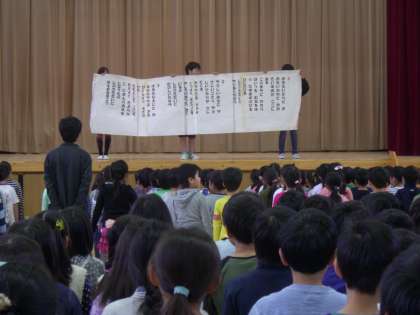 今朝は、音楽集会。全学年が体育館に集まって、集会で校歌を歌いました。音楽の瀧田先生から歌詞の内容を含めた歌唱指導を受け、体育館いっぱいに素敵な歌声を響かせていました。