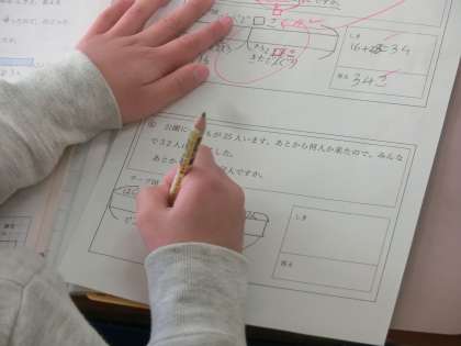 2月20日(水)2年生の算数です。文章問題を図を使って考えます。学習も後半になってきているので、どの子もすぐに図をかいて考えることができています。図から式を導き出すこともできます。自分たちでどんどん学習を進めています。