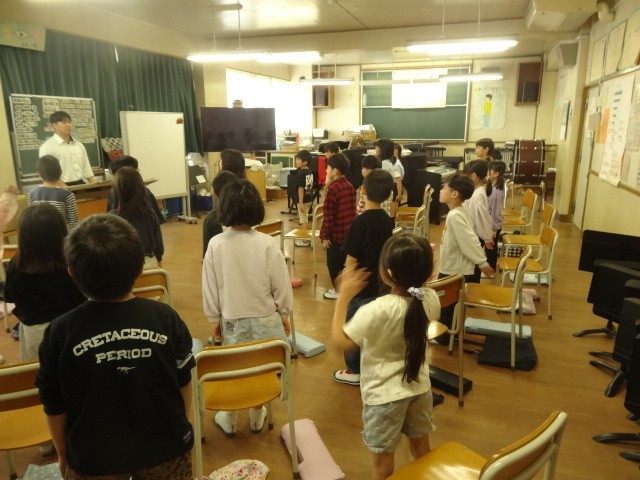 音楽は、2年生から音楽室で専科の先生の授業となります。まず始めに音楽室でのルール(音に合わせて起立や着席、礼の仕方)等を練習していました。