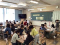 「今日は、中国の料理ではおなじみのバンバンジーです。細長く切った材料をさとう・しょうゆ・酢・塩・チーマージャンで作ったたれであえます。たっぷりとごまを使うのが特徴です。材料のとり肉は、むね肉を使うことが多いのですが、今日は「ささみ」を使いました。ささみはサラダや和えものによく使われます。給食室では、ささみ肉を蒸した後、手で細長く手でほぐしてバンバンジーを作りました。今日も味わっていただきましょう。」