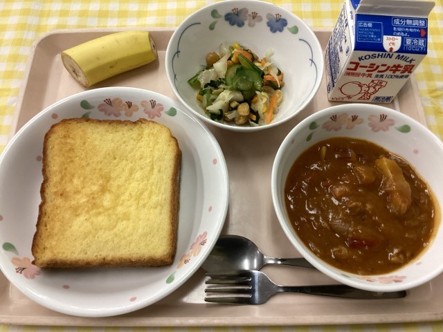 秋のポークシチューには、さつまいもが入っています。調理員さんが丁寧にブラウンルゥを作ってくださり、玉ねぎもじっくりと炒めてくださったので、とても味わい深いシチューに仕上がりました。