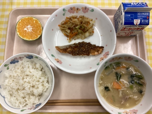 鮭のごまだれは、すりごまといりごま、2種類のごまを使って作っています。ご飯がすすむ!と、人気のごまだれです。今日のみかんは、長崎県産の早生みかんです。皮はまだ青いですが、甘みはしっかりとしていました。