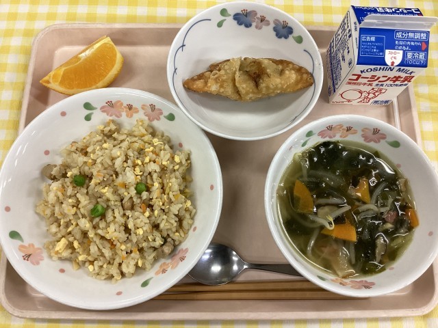 今日のチャーハンには、角切りの焼き豚がゴロゴロと入っています。揚げぎょうざはひとつひとつ包んで、揚げています。「今日の給食ぜんぶおいしい!」「今日の給食ぜんぶ好き!!」と、感想を言ってくれる子がたくさんいました。