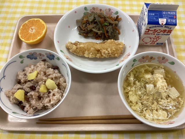 明日は平井小学校の開校記念日です。今年は99歳!お祝いの気持ちを込めたこんだてを揃えました。「今日の給食おいしそう〜!」と、食べる前から子どもたちは、ワクワクとした様子でした。ふっくらとした赤飯、ホクホクの栗、サクサクのたつた揚げ、シャキシャキのきんぴら、だしの効いたかきたま汁…どれもみんな、よく味わって食べてくれている様子でした。