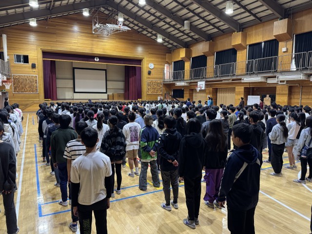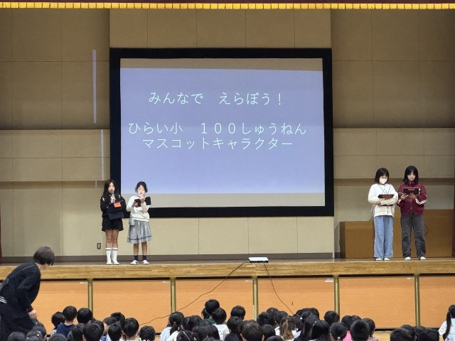 昨日は、開校記念集会を行いました。代表委員会が、平井小学校を卒業された荒井さんにインタビューした内容をクイズや劇にして、会を進行しました。最後にお祝いの気持ちを込めて、校歌も歌いました。