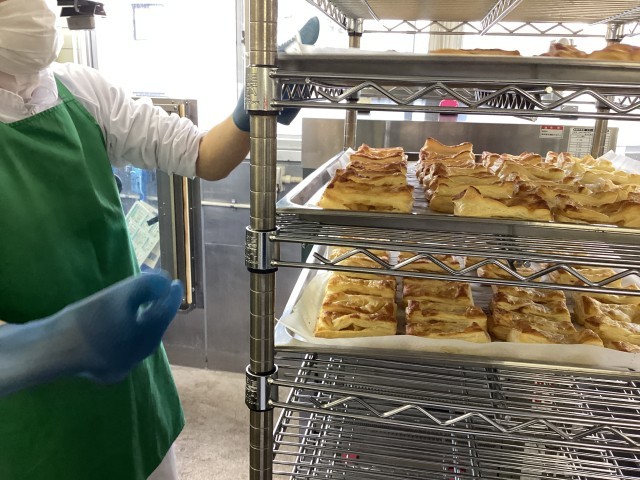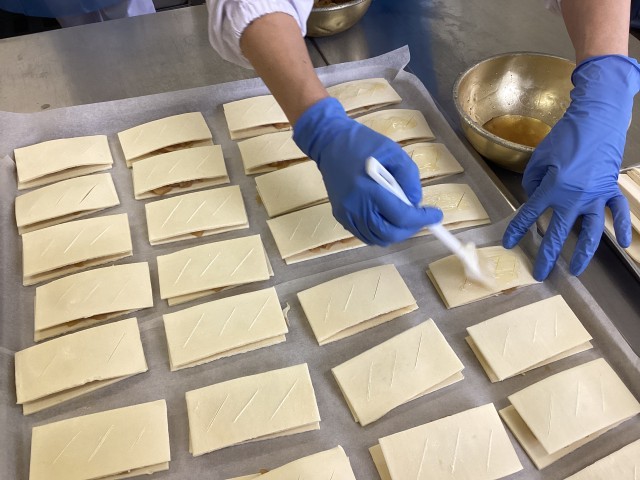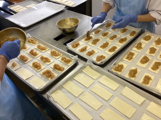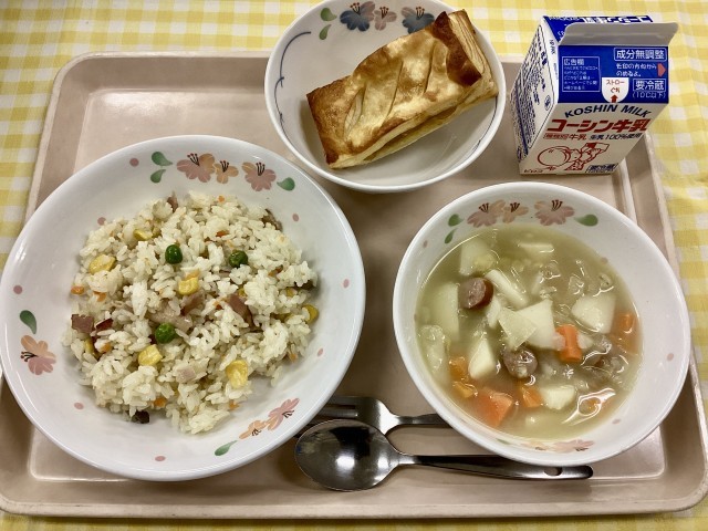 3年生の器楽発表「ハイホー」にちなみ、白雪姫が食べたりんごをモチーフにアップルパイを焼きました。給食室でりんごを煮詰めてフィリングから手作りしています。サクサクに焼きあがったパイに、子どもたちは大興奮!どのクラスもみんな、喜んで食べてくれました。3年生の発表が楽しみですね♪