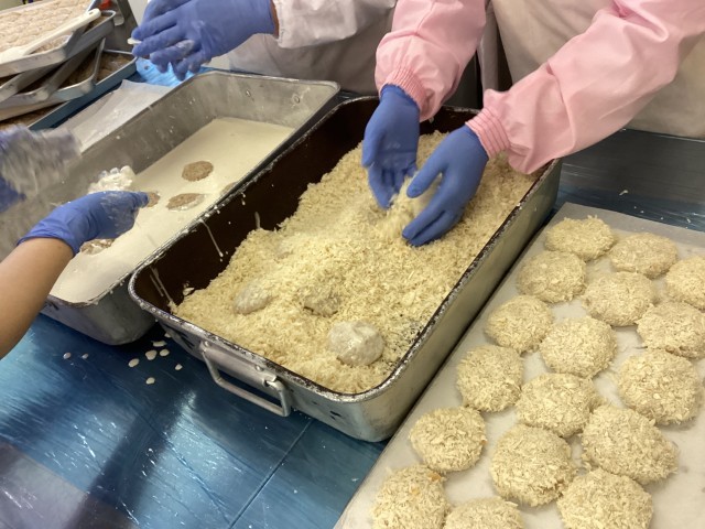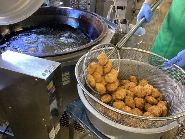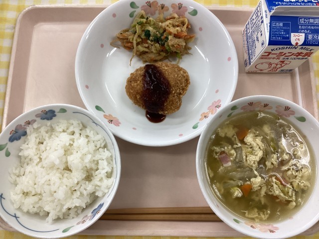 メンチカツは、日本生まれの洋食です。豚ひき肉に玉ねぎやパン粉を合わせて捏ねて、衣をつけて揚げています。一口かじるとサクサクッ!という食感の次に、ジューシーな肉汁が♪「メンチカツ、すごくおいしいです!」と、1年生もニコニコしながら食べてくれました。