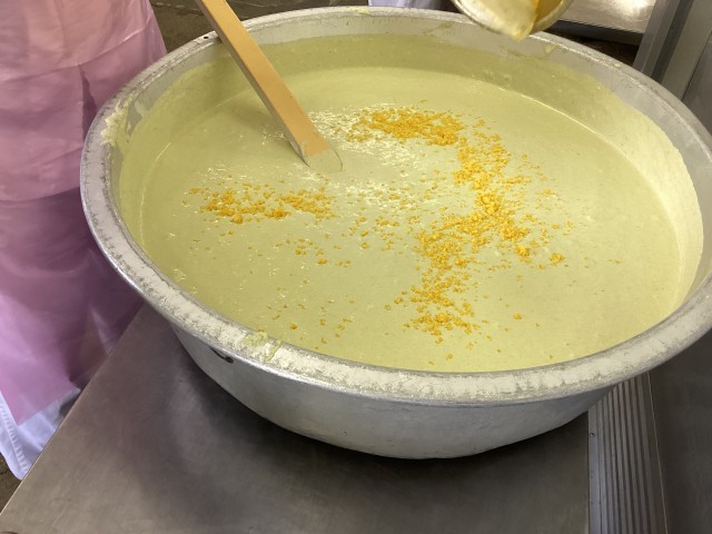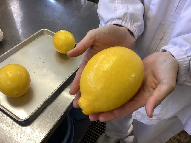 今日のチーズケーキには、東京都八丈島産の明日葉粉と、八丈レモンを使っています。八丈レモンはフルーツレモンとも呼ばれるほど甘くて、手のひらサイズほどに大きいのが特徴です。果汁だけでなく、皮まで使用したチーズケーキは爽やかな香りで、子どもたちは「チーズケーキ、甘酸っぱくておいしいです!」と感想を伝えてくれました。