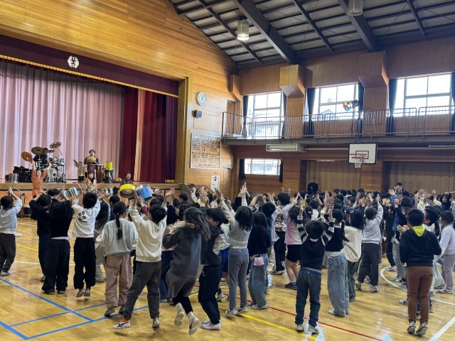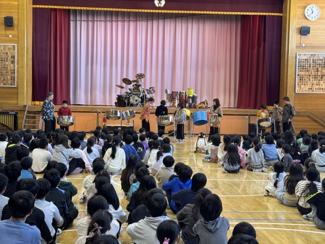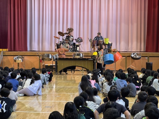 今回は、「東京パノラマパーカッション」の皆さんをお招きして、様々な楽器を使いながら、演奏していただきました。代表児童も演奏体験をさせていただきながら、全校児童みんなで楽しい時間を過ごすことができました。