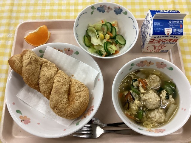 今日のこんだては、5年2組の給食委員さんが考えてくれました。きなこ揚げパンについて、「香ばしさとサクサクとした食感、そしておいしさが、みんなの体と心をしっかりとサポートしてくれます。」とアピールしてくれました。確かに、揚げパンを食べるとみんなニコニコ、心も満たされます。とっても素敵な表現だなと思いました。