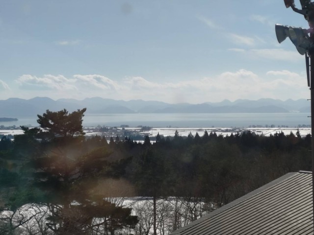 猪苗代湖を背に、入所式です。雪はちょっと少なめです。午後はそり遊び広場は使えるかな?