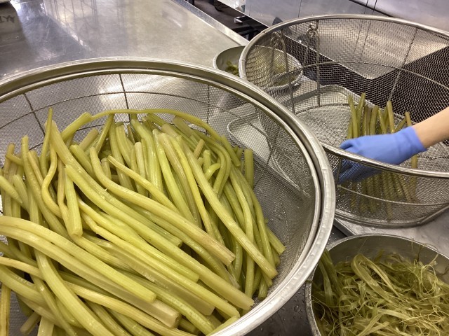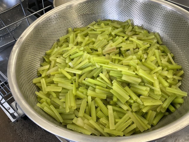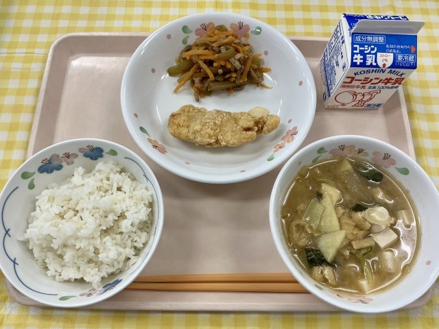 今日は、季節の山菜【ふき】を使ってきんぴらを作りました。ふきには筋がありますが、1本1本調理員さんが丁寧に取ってくださいました。ふきには独特の苦みがありますが、年に一度の味わい、楽しみにしてくれている声もたくさん聞こえてきました。また、今日は「みそしるのじゃがいもがおいしい!」と言ってくれる1年生が。「やわらかいからおいしい」「味がしみこんでいるからおいしい」と、理由もしっかりと説明してくれました💮