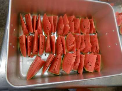 写真は、(左)今日の給食、(右)各クラスに配缶した西瓜です。西瓜もなすと同じ夏野菜です。夏野菜は、水分が多いことが特徴です。積極的に食べて、熱中症を予防しましょう。