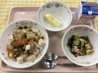 《献立》ごぼうごはん、チキンサラダ、味噌スープ、牛乳