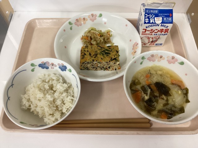ごはん、牛乳、ひじきいり卵焼き、ツナと野菜のごま和え、豆乳入り味噌汁