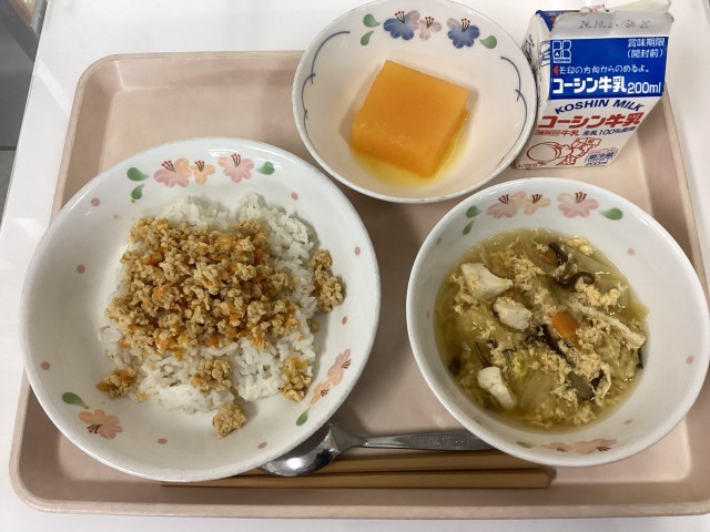 高野豆腐のそぼろ丼、牛乳、白菜のかきたま味噌汁、キャロットオレンジゼリー