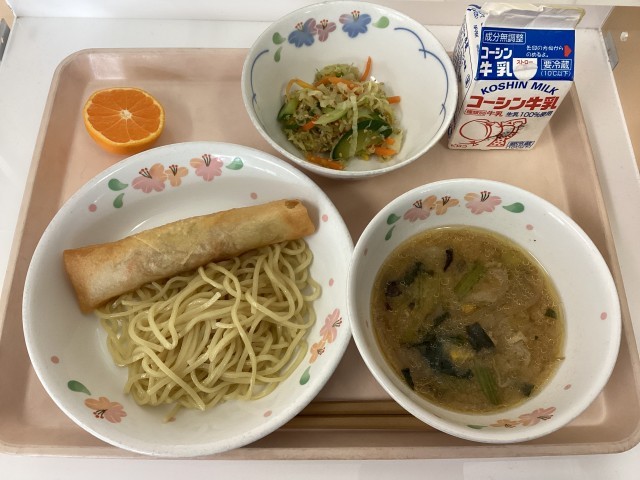 味噌ラーメン、牛乳、春巻き、じゃこサラダ、菊花みかん