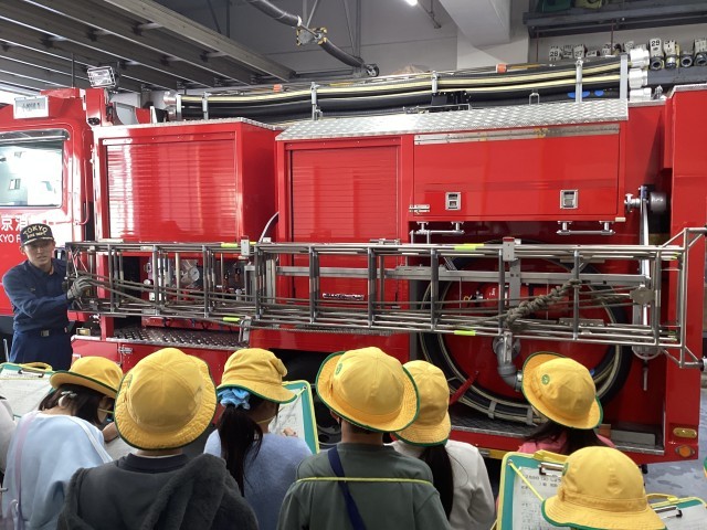 江戸川消防署小松川出張所で普段は見ることのできない、消防車の中のものや仮眠室等を見せていただきました。