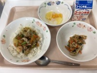 厚揚げぶたキムチ丼、牛乳、豆乳わんたんスープ、フルーツのヨーグルトがけ