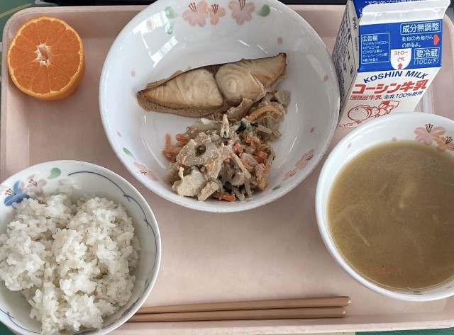 ごはん、さわらのゆうあんやき、れんこんのゴマあえ、冬至のかぼちゃみそしる、きっかみかん、牛乳