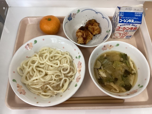 味噌けんちんうどん、牛乳、ポテトタコ揚げ、みかん